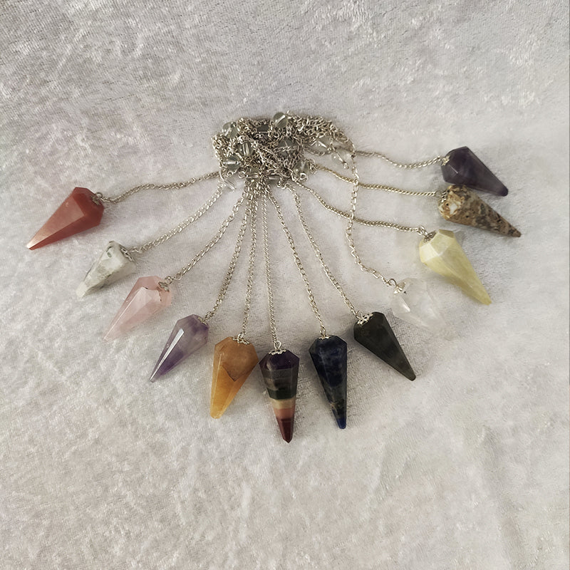 El material del péndulo es aleatorio, permite que el Universo elija lo que conecta contigo en este momento, puede ser de ágatas variadas, amatista, amazonita, aventurinas variadas, cuarzos variados, fluorita, jaspes variados, labradorita, piedra sol, piedra luna, péndulo de chakras...